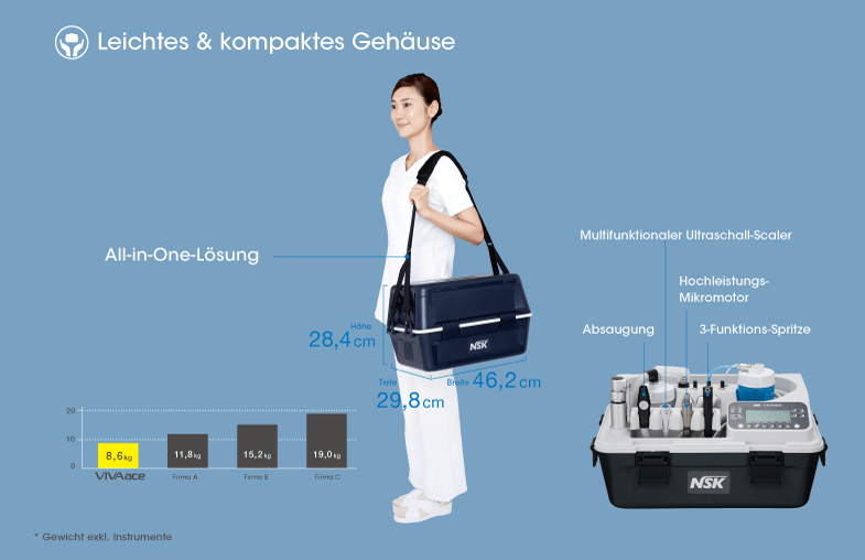 - VIVA ace Basisset (Steuereinheit, Stromkabel, Koffer, Fußsteuerung, Absaugschlauch komplett, Sekretbehälter, Absaugkanülen 10 Stk., Wasserflasche komplett, 3-F-Spritzen-Kit, Tragegurt)