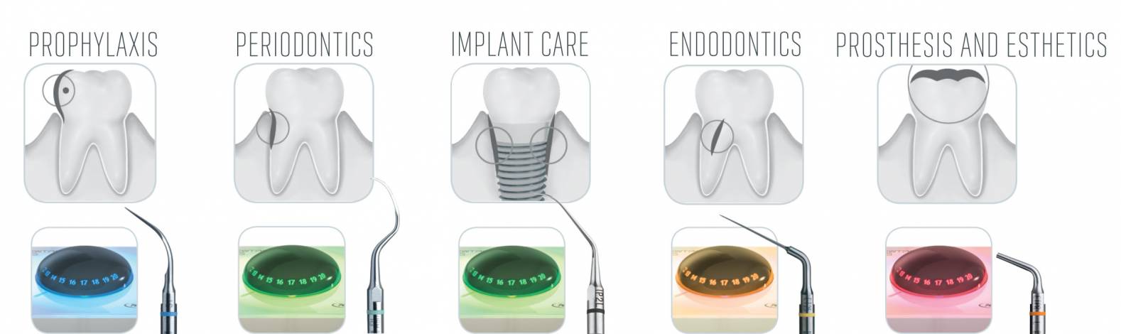 Fast 80 Ultraschallspitzen ermöglichen eine große Palette an klinischen Anwendungsgebieten.
